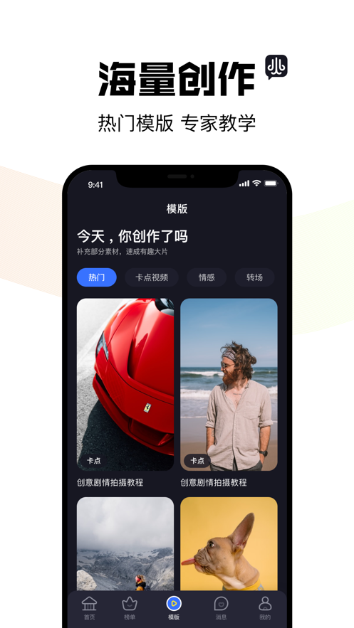 海量创作:模板中心每月更新300+行业热点模板,支持语音输入自动生成字幕。独创"智能混剪"功能,上传原始素材可自动匹配节奏生成多版本视频。