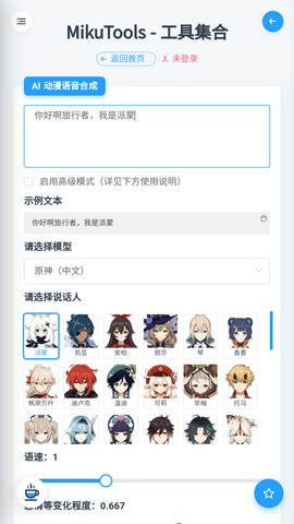 MikuTools是一款功能丰富且实用的在线工具集合,特别受到游戏爱好者的青睐。它不仅能合成《原神》《第五人格》《凹凸世界》等热门游戏的语音包,还提供了多种便捷的小工具。软件界面设计简洁美观,操作流畅,所有功能均可免费使用。用户只需下载软件,进入对应的语音合成页面,输入想要合成的文本并选择游戏角色,即可快速生成个性化的语音内容。无论是娱乐还是日常需求,MikuTools都能满足用户多样化的使用场景。