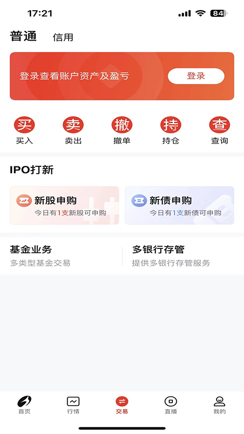4、交易模块实现全业务线上化办理,普通交易与信用交易无缝切换。融资融券功能支持担保品智能折算率计算,实时显示可用额度,并提供风险预警提示服务。
