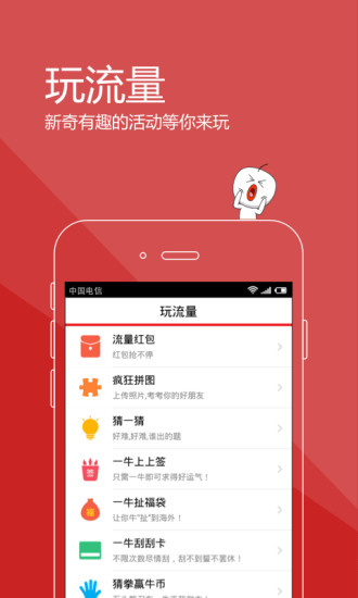5.玩流量:玩抽签、刮刮卡、扯福袋、剪刀石头布,拼手气、撞人品,流量豪礼送不停。每日更新的小游戏不仅趣味性强,中奖率更是高达80%,让用户在娱乐中轻松获取额外流量奖励。