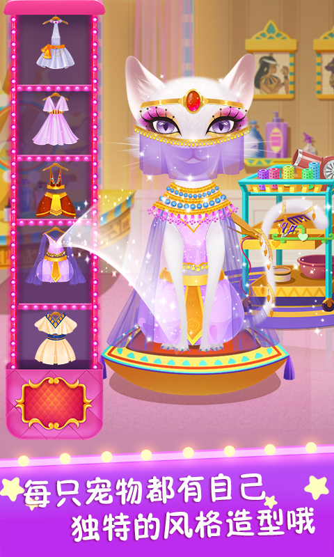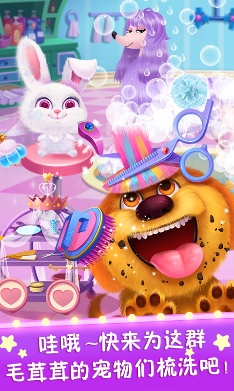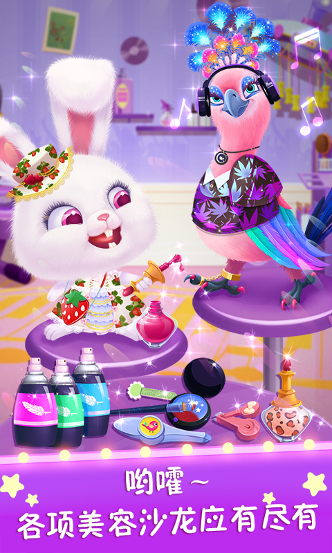 每个美容小游戏结束后,都可以为相应宠物打扮更换各种造型,你可以随心所欲的搭配出一只最合心意的个性萌宠哟~游戏内提供了超过500种服饰和配饰,从可爱的蝴蝶结到帅气的领结,从时尚的小裙子到酷炫的太阳镜,应有尽有。你还可以通过染色功能改变宠物的毛色,创造出独一无二的毛绒小伙伴。