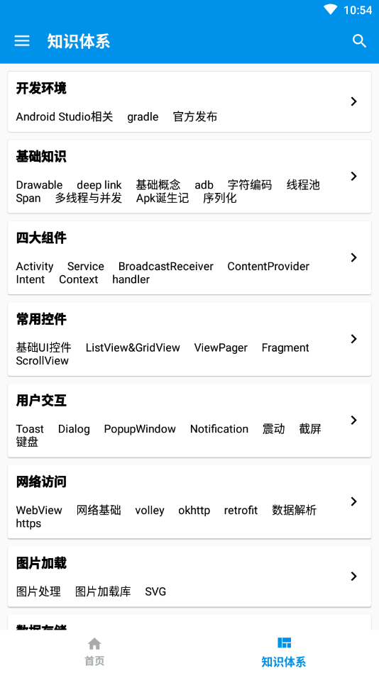 3、更新速度很快,每周都会新增当下流行的技术专题如Compose、MVVM等,知识体系采用树状分类结构,支持关键词快速搜索和书签收藏功能。