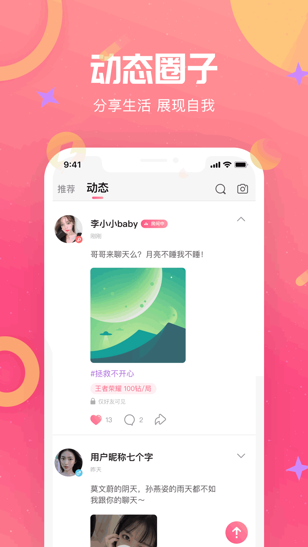 通过动态分享功能,您可以随时记录生活点滴,展现真实自我,寻找情感共鸣,与更多朋友建立深度连接;