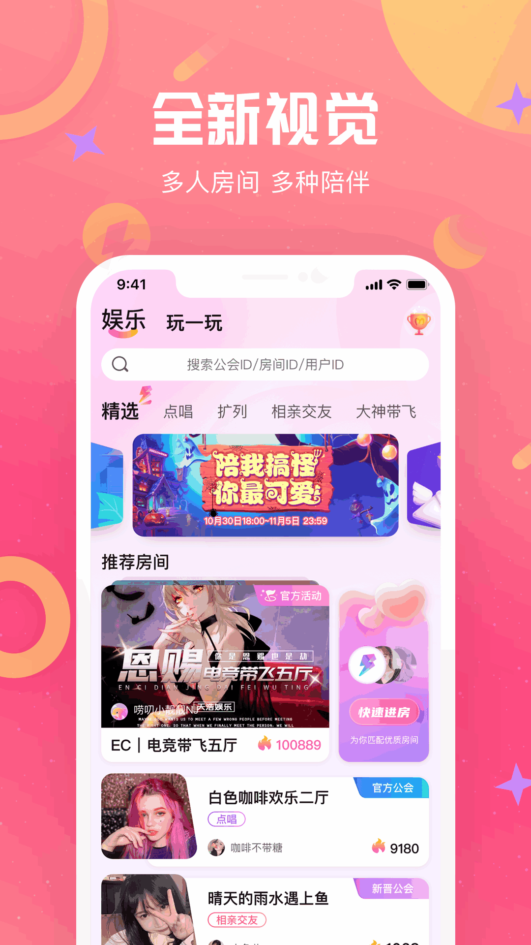 精心设计的房间界面,提供多种陪伴模式,让您在不同的社交场景中邂逅不一样的缘分,感受全新的视觉享受;