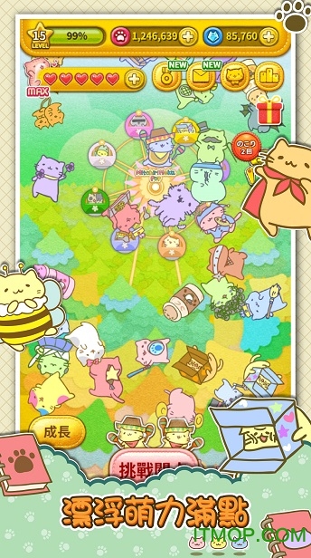 消除玩法設計巧妙,連擊系統讓遊戲充滿挑戰性。肉球幣可以用來升級貓咪能力,打造專屬的強力隊伍。