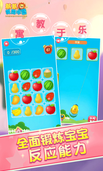 经典消除玩法融入早教元素,需要滑动屏幕将相同水果配对消除。游戏会记录宝宝的消除速度和准确率,随着关卡提升会增加水果种类和排列复杂度。消除成功时会播放该水果的营养价值语音介绍,寓教于乐。