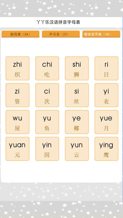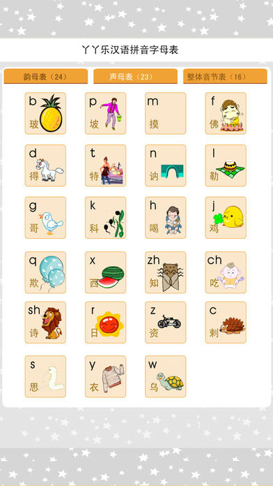 本APP提供声母、韵母和整体认读音节的系统学习,涵盖拼音学习的全部内容。包含听读练习、书写指导、拼读训练、拼音卡片、拼音表等多种学习模式,以及拼音与汉字读音的对应关系教学。特别值得一提的是,APP中还收录了大量与拼音相关的常用汉字,让孩子在学习拼音的同时也能认识新字。所有教学内容都配有标准发音示范和趣味互动练习,通过游戏化的学习方式激发孩子的学习兴趣,帮助孩子在短时间内高效掌握汉语拼音知识。