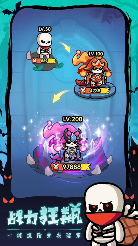 新版优化了养成系统,新增"骨龄加速"功能可瞬间完成亡灵进化,但会消耗珍贵的时之沙道具。重做的技能树系统采用神经网络图形式,每个节点激活后会影响相邻技能的解锁条件。独特的"骸骨回响"机制确保资源零浪费,当分解高等级亡灵时,系统会返还110%的养成材料,让玩家可以放心尝试各种养成路线。