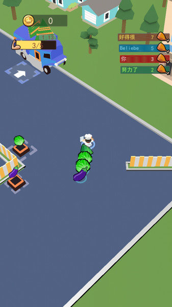 游戏开始时,系统会为玩家随机匹配对手。通过简单的滑动操作控制厨师在场景中移动,收集散落各处的美食并运送到自己的餐车上。游戏采用类似贪吃蛇的机制,当其他玩家触碰到你收集的食材时,这些食材就会被对方抢走。玩家可以主动出击抢夺他人的食材,在增加自己分数的同时削弱对手的优势。最终,在限定时间内运送最多食材到餐车的玩家将获得胜利。