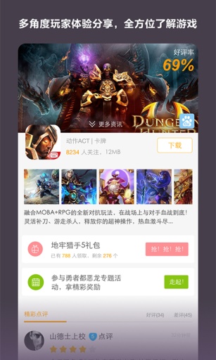 1、成为手游界的大众点评,成为玩家选择游戏的必备工具。平台汇集了上万款手游的真实玩家评价,通过大数据分析生成游戏评分,帮助玩家快速找到优质游戏。每款游戏都有详细的优缺点分析,避免玩家踩雷。