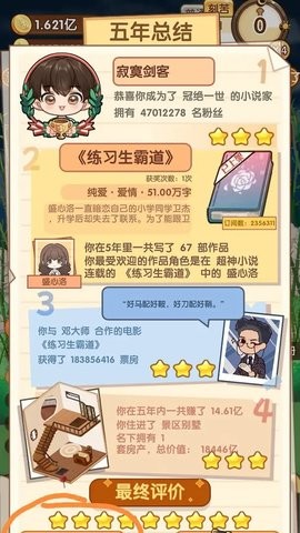 MOD系统获得专利技术,支持热加载和无缝切换,不影响游戏进程。2.题材分类系统参考了图书馆分类法,每个题材都有对应的专属UI主题。3.智能工具采用云计算辅助,复杂运算在服务器端完成,不占用本地资源。4.画面使用HDR渲染技术,支持4K分辨率,文字显示特别优化了抗锯齿效果。5.多语言输入法深度适配,支持中日韩等语言的直接创作输入。6.社交系统包含线上创作马拉松等定期活动,优胜作品会进入游戏推荐位。7.成就系统与Steam平台深度集成,部分稀有成就带有全球排名功能。8.剧情任务由专业编剧团队打造,包含多个感人至深的文学追梦故事。