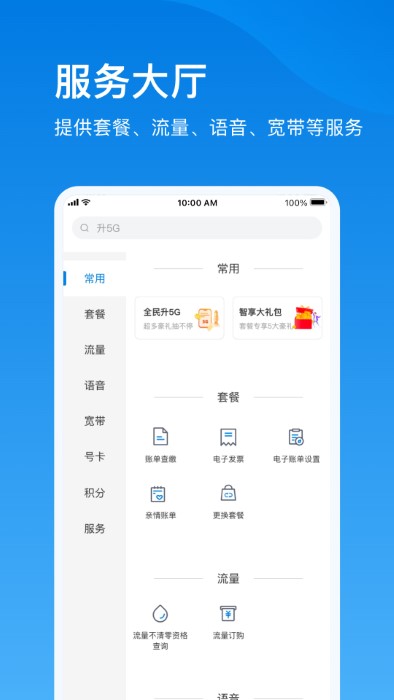 话费查询、流量查询、账单查询、交费充值、积分查询兑换、业务办理等,满足日常通信需求。