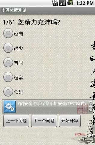 中医体质测试是一款基于传统中医理论开发的健康自测应用,通过科学化的问卷评估帮助用户了解自身体质类型。该应用依据中华中医药学会发布的《中医体质分类与判定》标准,采用专业算法对用户答题数据进行分析,可准确识别平和质、气虚质、阳虚质等九种体质类型。用户只需花费5-10分钟完成简单问答,即可获得包含体质特征、易患疾病和调理建议的详细报告。应用界面简洁友好,测试过程无需专业知识,适合所有关注健康养生的人群定期使用,是进行中医体质辨识和健康管理的便捷工具。
