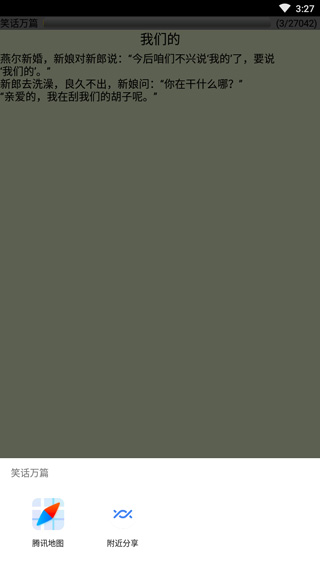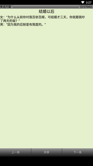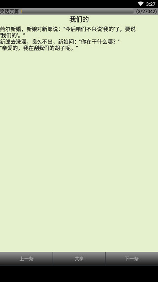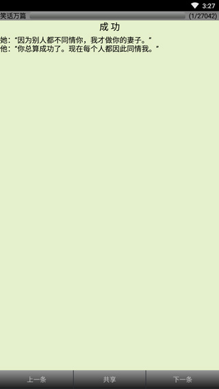 1、软件收录了超过20000篇优质笑话内容,全部支持离线阅读功能。无需联网、无需更新,即使在信号不佳的地铁、电梯等场所也能随时阅读。按照每天阅读50篇的速度计算,足够你连续阅读一整年,保证每天都有新鲜笑料。2、智能记忆功能会自动保存你的阅读进度,每次打开应用都会精准定位到上次阅读的位置。进度条清晰显示已读和未读笑话数量,让你随时掌握阅读进度。3、采用极简设计理念,界面直观明了,操作逻辑简单顺畅,即使是初次使用的用户也能快速上手。4、支持一键分享功能,可以将精彩笑话通过短信、微博等多种社交平台转发给好友,让快乐传递更便捷。