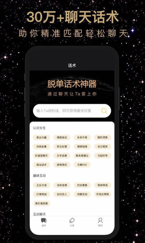 【分类指导】 - 不管、陌陌还是夜店、酒吧、街头;不管是刚认识还是处于暧昧期,支持全场景全流程覆盖。针对不同社交场景提供专属应对策略。