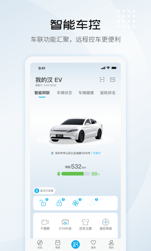 目前支持秦、思锐、E6先锋等多款车型,通过云钥匙和云控制技术,为用户开启智能车联网新时代,让科技改变出行方式。