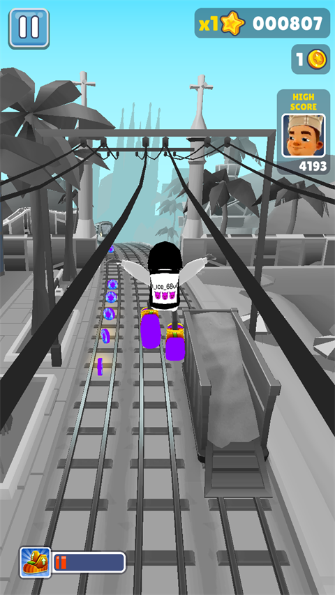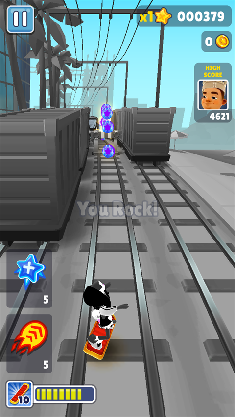 双击屏幕可启动滑板道具,如果在没有启动滑板功能的情况下,角色撞上障碍物或者火车游戏就会结束,而在滑板状态下,等于给角色买了保险,滑板会在撞到障碍物时消失,但游戏可以继续进行。滑板在消失后的几秒内出现冷却时间,当闪烁结束后可通过双击再次启动,没有次数的限制。建议在熟悉游戏节奏后再使用,可以大幅提高生存时间和得分。