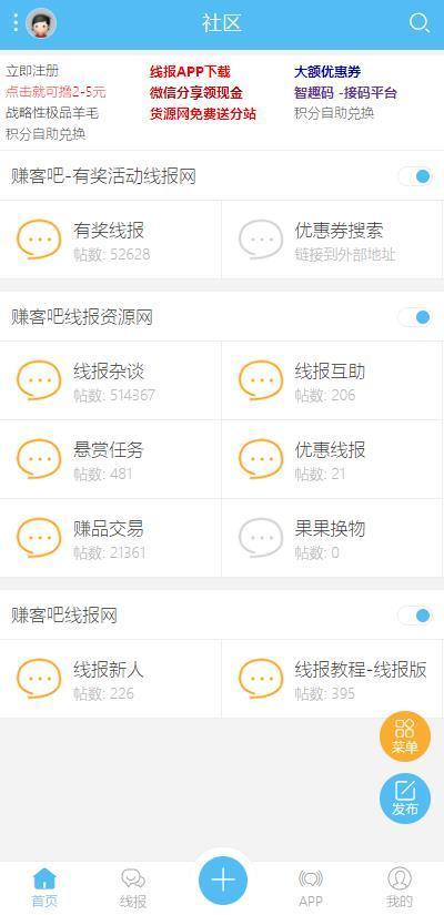 4、它有论坛、贡献、我喜欢的、资源、综合等部分。社区板块采用兴趣标签分类,用户可以快速找到同好圈子,分享赚钱心得和生活趣事。