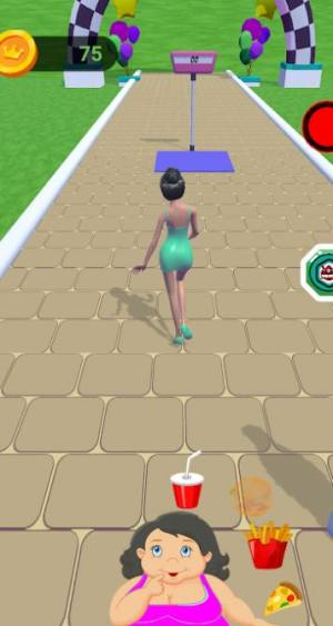 1、健身跑步是游戏的核心玩法,玩家需要控制角色持续奔跑来消耗卡路里,同时要注意及时补充健康食物来维持体力。2、路上会遇到各种高热量的障碍物,如巨型汉堡、冰淇淋山等,需要灵活躲避这些会让你发胖的美食陷阱。3、游戏中还有可爱的美女角色,玩家需要通过合理饮食和运动帮助她们塑造完美身材,这个过程需要极强的自制力来抵抗美食诱惑。