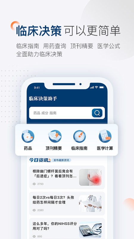 临床决策助手手机版是上海医米信息技术有限公司专为医疗从业者打造的一款智能化临床辅助工具。这款软件集成了丰富的医学资源和实用功能,能够帮助医生快速获取权威临床指南、精准计算医学公式、查询药品信息以及追踪最新医学研究进展。通过简洁直观的界面设计,用户可以轻松查阅2万+临床指南、5万+药品数据库和110+顶级医学期刊精要,大幅提升临床决策效率。无论是日常诊疗、用药参考还是学术研究,这款应用都能为医疗工作者提供强有力的专业支持,让复杂的医学知识变得触手可及。