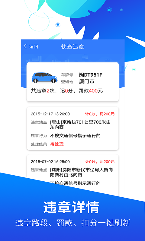 8.更新了全国违章数据库,确保数据实时准确。与各地交管系统保持同步更新,违章信息延迟不超过24小时。