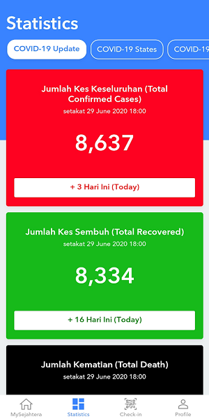 用户可通过statistics功能查看马来西亚每日疫情数据,包括新增确诊、康复等关键指标。点击"COVID-19state"和"COVID-19global"还可分别查看各州及全球疫情动态,帮助用户全面掌握疫情发展态势。