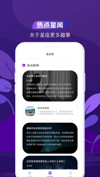 4、运势推送,星座专栏:每日推送最新星座运势,并设有专业星座知识专栏,让用户随时掌握星座动态和深度解析。