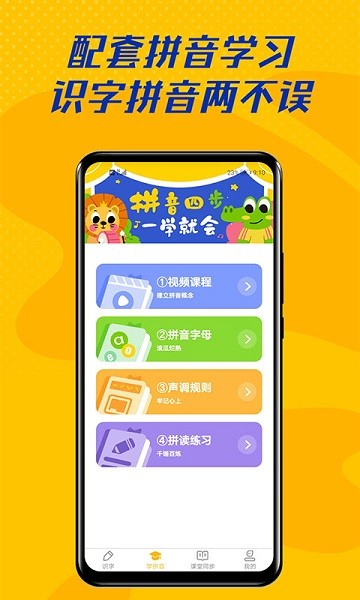 互动课堂功能,包含识字游戏、儿歌学字、动画故事等多种形式。比如"汉字找朋友"游戏训练组词能力,"汉字拼图"锻炼观察力。