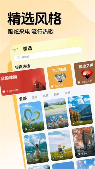 6.分类清晰:铃声按风格、语种、场景等分类,方便查找。除了常规分类外,还提供节日专题、季节限定等特色分类,让铃声选择更有趣。