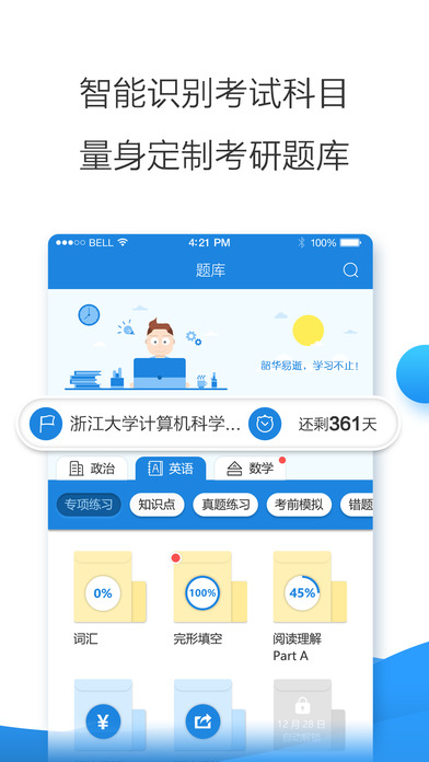1、考研精品专业问答内容覆盖全面,从基础概念到高阶技巧,让考研复习再无盲区;2、支持微信、微博、QQ等多种社交账号一键登录,省去繁琐注册流程,快速开启学习之旅;3、专业科目涵盖计算机、心理学、西医综合、教育学、管综数学、法硕等热门领域;4、考研真题库权威可靠,提供顺序练习、随机测试、模拟考试三种模式,最大化真题使用价值;5、辅导体系完善,包含知识点精讲、互动答疑、教学视频等模块,构建完整学习闭环;6、考研英语、数学、政治等学科的名师视频课程多达46个系列,满足不同学习需求;7、知否功能全新上线,遇到难题可快速搜索解答,实现即时学习支持;8、收录历年考研真题,配合智能刷题系统,打造沉浸式做题体验;9、错题自动归集功能结合学习效果统计分析,智能推荐薄弱知识点强化训练;10、政治、英语、数学等科目均提供名师精选冲刺题库,配有深度解析;11、持续接入各大教育机构优质视频资源,实现教学内容的多元化选择;12、新增大学英语四六级备考模块,听力、阅读、写作等专项训练一应俱全;13、四六级备考提供单词记忆、翻译技巧、作文模板等特色功能,全面提升应试能力;14、名师考试技巧视频和专项强化课程帮助用户突破四六级考试瓶颈。