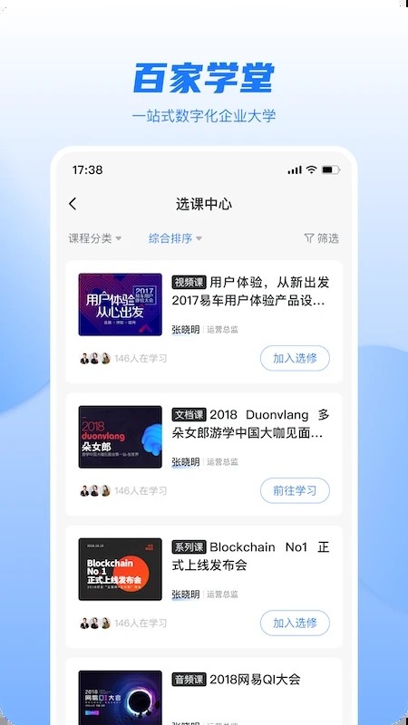 百家学堂官方版是一款专业的企业在线培训平台,致力于为企业提供全方位的数字化培训解决方案。平台整合了丰富的课程资源和多样化的培训模式,通过知识运营、学习管理和能力提升的闭环体系,帮助企业打造高效的学习型组织。学员可以在平台上进行系统化学习、参与互动交流,并获得个性化的学习指导,确保培训质量和效果。无论是新员工入职培训还是管理层能力提升,百家学堂都能提供专业支持。