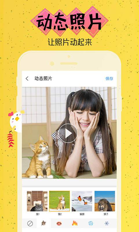 将普通照片升级为魔法时刻!只需选择相册中的任意照片,添加飘雪、花瓣雨等12种自然特效,或插入搞怪动画角色,就能生成独一无二的动态影像。支持导出为GIF或MP4格式,内存占用仅为普通视频的1/5。