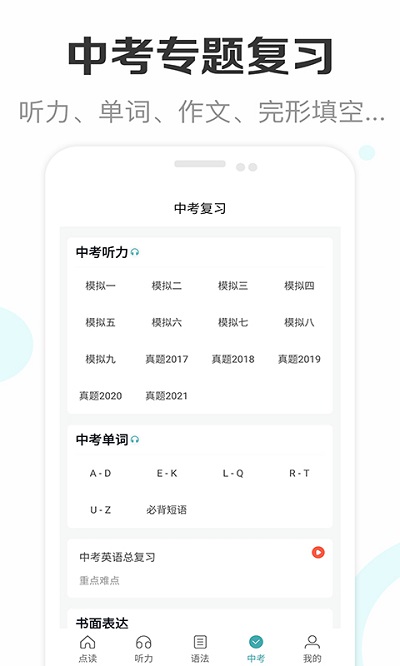 收录历年中考英语听力真题,还原考场原始录音环境;提供语法、单选、写作等专题讲解和针对性练习;汇总历年中考易错题,配备详细解析;精选中考核心2000词,真人高清发音,可跟读点读;中考听力模拟练习完全参照真题标准,确保难度、语速和清晰度一致,帮助考生提前适应考试节奏。