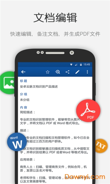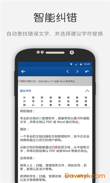 1.支持使用手机摄像头直接拍摄文档(包括报纸、杂志、书本等),即时进行文字识别;