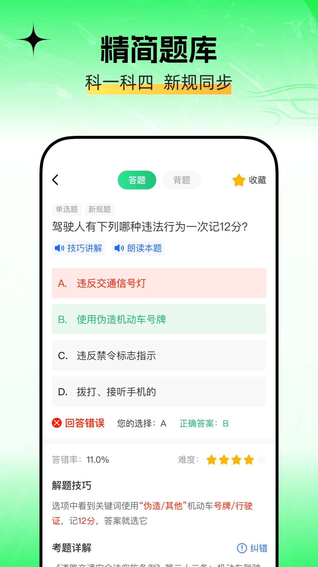 新规题库全涵盖,驾照考试不用愁!这是一款专为驾考学员打造的备考神器,全面覆盖最新交规题库,助您轻松应对科目一和科目四的理论考试。无论是交通法规、安全驾驶知识,还是道路标志识别,所有考点一网打尽。智能练习模式根据您的答题情况自动调整难度,让学习更高效。更有模拟考试功能,真实还原考场环境,帮助您提前适应考试节奏,提升通过率。告别死记硬背,科学备考,驾照考试一次过!
