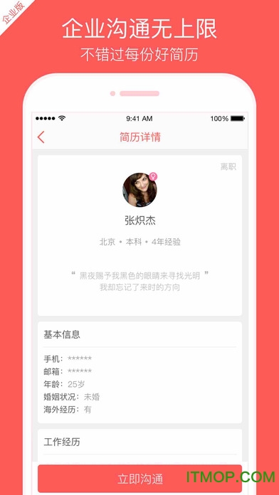 1. 海量岗位资源,覆盖全国各行业和城市。 2. 智能匹配算法,精准推荐职位和人才。 3. 简历优化工具,帮助求职者提升竞争力。 4. 企业招聘系统高效便捷,支持批量筛选。 5. 提供职业测评和规划服务,助力职场发展。 6. 用户界面简洁友好,操作流程清晰易懂。