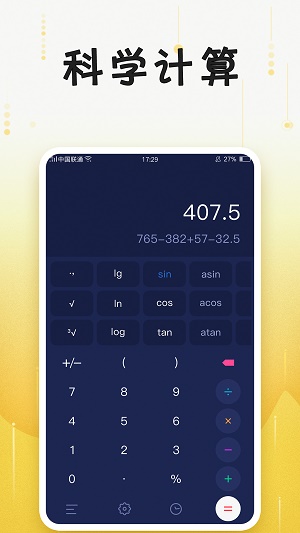 科学计算器:涵盖对数函数、三角函数、绝对值、反三角函数、阶乘、随机数、平方根等高级功能,适用于复杂计算场景。