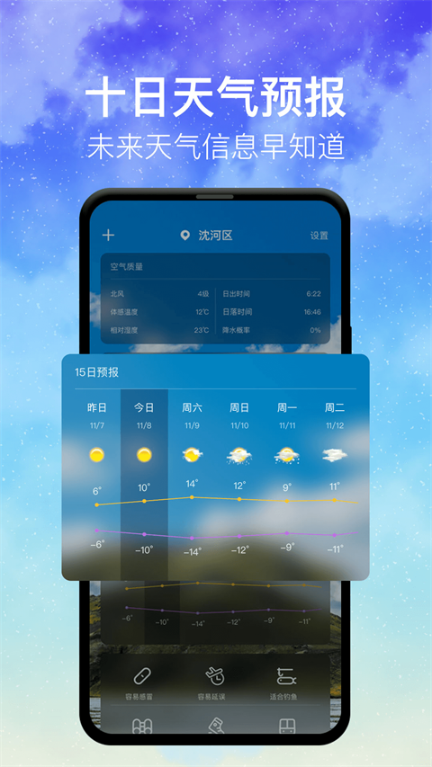 天气预报:提供当前天气状况及未来15天的详细天气预报,包括每小时天气变化趋势和日间温差曲线。