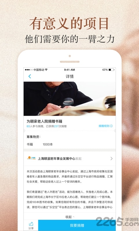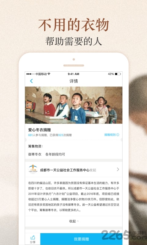 乐空空是一款由百姓网打造的公益捐赠平台,致力于为用户提供便捷的闲置物品处理方案。通过这个平台,您可以将家中闲置的物品捐赠给真正需要的人,包括山区儿童、养老院老人、留守儿童以及贫困村落的人们。这不仅能让您的家居环境更加整洁舒适,还能传递爱心,帮助他人改善生活。用户只需简单提交捐赠物品信息,平台就会提供捐赠地址,让您的爱心轻松送达。快来2265安卓网下载体验,让闲置物品焕发新生,让爱心温暖世界!
