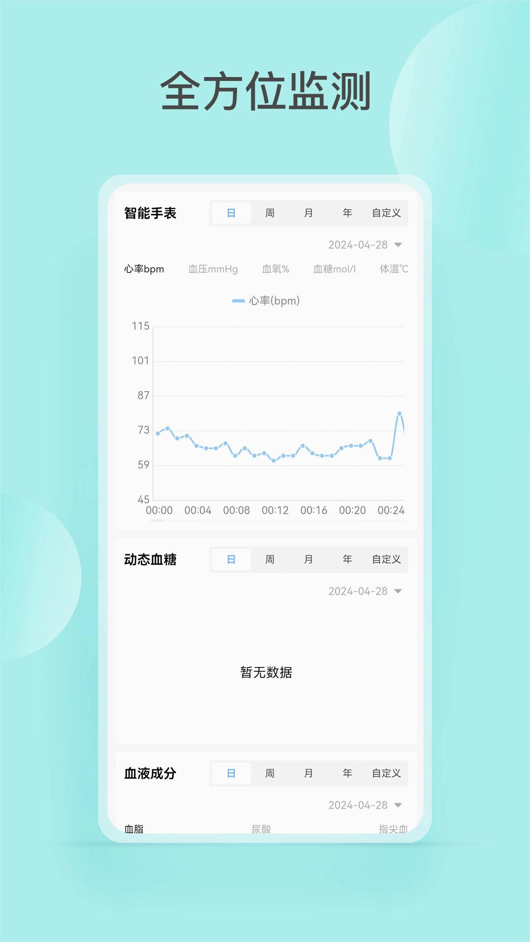 2、全方位监测:支持多种健康指标的监测,包括生理指标、运动数据、睡眠质量等,形成完整的健康档案。