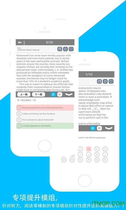 3、专项模组:特别设计了听力理解、阅读理解等专项提升模块,每个模块包含100+精选练习题和详细解析。通过科学的训练体系,帮助用户在短时间内显著提升特定题型的得分能力。