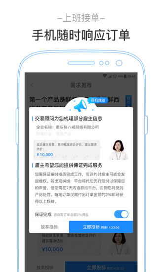 需求市场:每日更新数万条经过严格审核的优质需求,配备智能推荐算法,可根据用户技能标签、历史接单记录等因素个性化展示匹配项目。