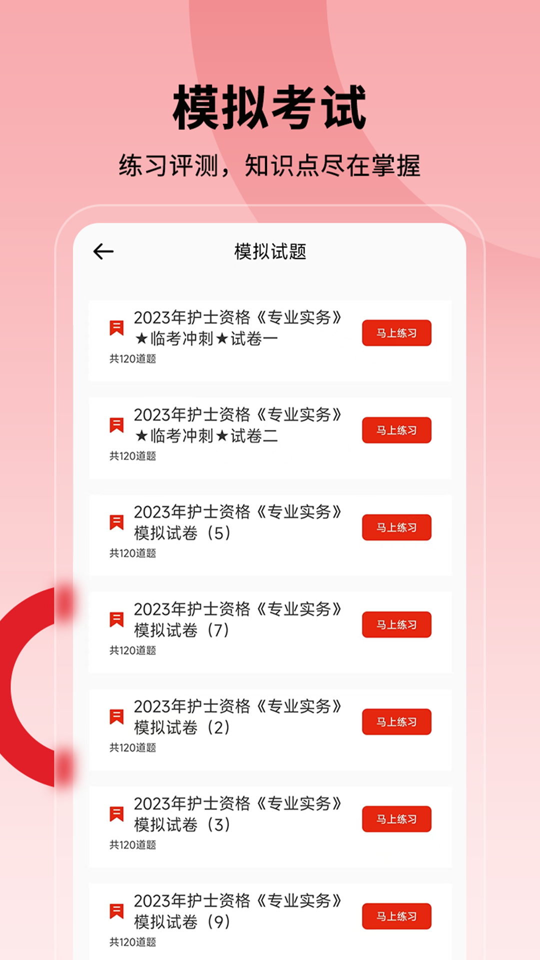 护士执业通app是一款专为护士资格考试学员打造的免费在线学习平台,通过手机即可轻松刷题和模拟医学考试,操作简单且功能强大。这款app汇聚了海量历年热门真题,涵盖护理学基础、内科护理、外科护理等多个科目,帮助用户系统性地提升专业知识水平和应试能力。无论是考前冲刺还是日常积累,护士执业通app都能为用户提供高效便捷的学习体验,是护士资格证备考路上的得力助手。