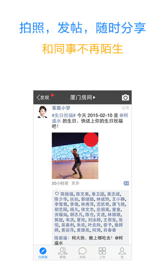 移动办公,工作轻松:同事圈为您提供多种办公轻应用,让审批流程更简单,让工作更高效。集成日程管理、任务分配、文件共享等功能,一站式解决办公需求。通过智能提醒和自动归档,帮助您更好地管理工作进度。所有办公数据云端同步,随时随地都能处理工作事务,真正实现移动办公的便利。