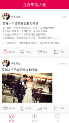 百万笑话大全收录了来自全国网友精心挑选的各类幽默内容,包括爆笑笑话、内涵段子、神回复等精彩内容,让你时刻保持好心情。应用中的笑话种类丰富多样,既有轻松诙谐的日常段子,也有让人忍俊不禁的无节操神回复,总有一款能戳中你的笑点。每日更新海量新鲜内容,保证让你笑不停。无论是想放松心情还是寻找聊天话题,这里都是你的最佳选择。快来加入百万笑话大家庭,开启你的欢乐之旅吧!
