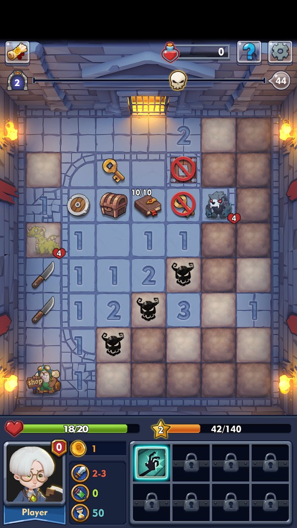 2,战斗采用了自动攻击的玩法,玩家在网状的地图中进行冒险,通过点击每一个方块都会显示出一些状态。这个设计完美复刻了经典扫雷的探索机制,但加入了RPG元素——翻开普通方块可能获得金币补给,而带有特殊标记的方块则会触发精英怪或宝箱事件。地图中隐藏着传送阵、陷阱机关等互动元素,玩家需要记忆已探索区域的特征来规划最优路线。随着层数加深,地图会动态生成诅咒区域、迷雾障碍等新机制,极大提升了策略维度。