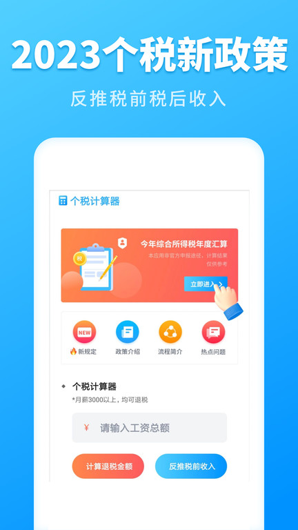 输入月工资即可快速估算退税金额,支持多种收入类型计算,包括年终奖、劳务报酬等,计算结果精准可靠。