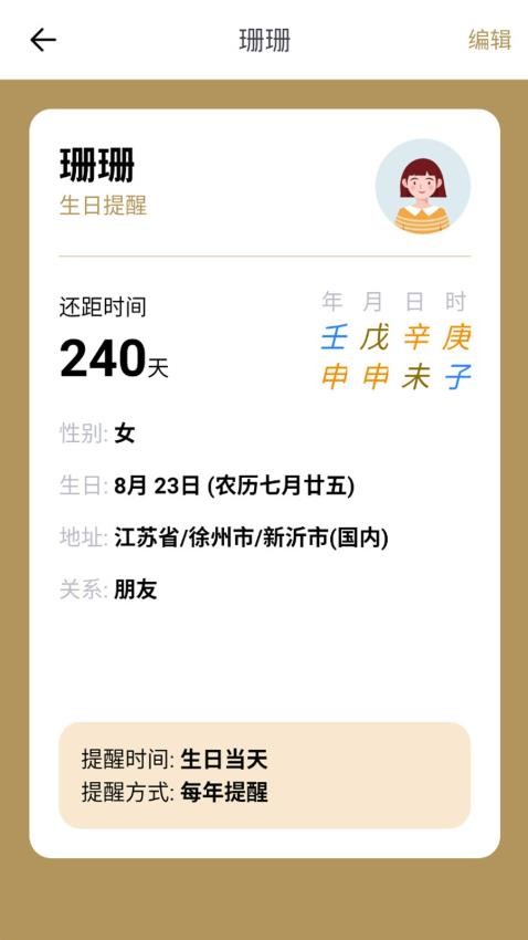 采用直观的操作界面设计,生日和纪念日信息的添加、修改、删除等操作都十分简便,即使是初次使用的用户也能快速上手,轻松管理所有重要日期。