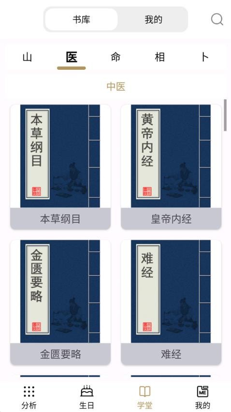 进入学堂板块,用户可通过分类浏览或关键词搜索查找感兴趣的命理书籍,支持在线阅读和收藏功能,打造个性化的学习空间。