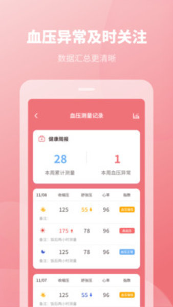 2、通过简单易懂的图形显示您一段时间内的血压变化和趋势;采用色彩区分正常/异常值,直观展示血压波动情况,降低数据理解门槛。